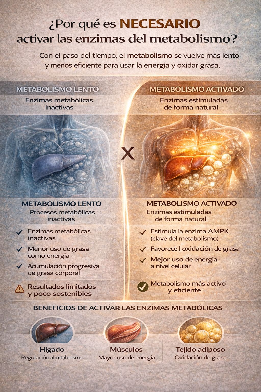 Con el paso de los años, el cuerpo reduce su capacidad de activar la quema de grasa de forma natural. Este suplemento ayuda a reactivar el metabolismo, optimizar el uso de la energía y apoyar la oxidación de grasa desde el interior, permitiendo resultados progresivos y sostenibles cuando se usa de forma constante.